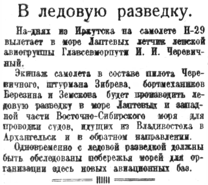 На-днях из Иркутска на самолете Н-29 вылетает в море Лаптевых летчик ленской авиагруппы Главсевморпути И. И. Черевичный.