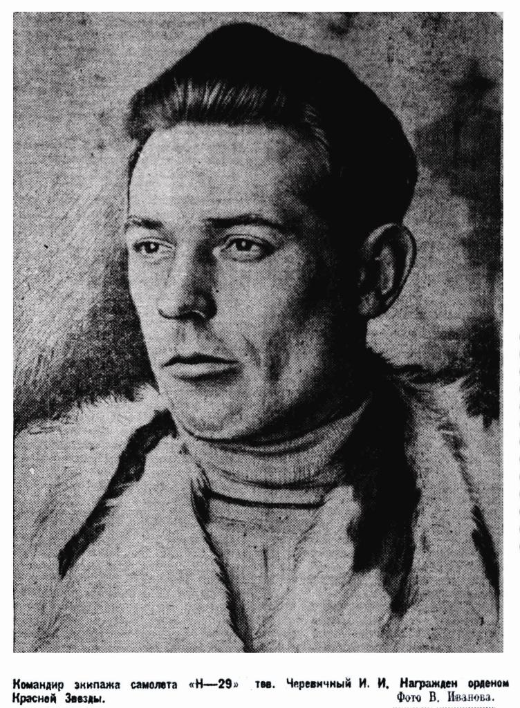 Летчик Черевичный Иван Иванович родился в 1909 году на Украине. Девятнадцати лет (в 1928 году) поступил в летную школу, окончив которую, до 1934 года работал в военной авиации. С апреля 1934 года т. Черевичный беспрерывно работает в Севморпути, выполняя различные ответственные задании в качество летчика.
