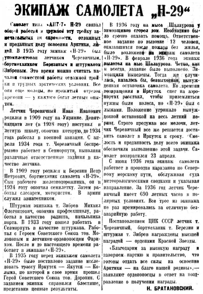 В 1935 году перед экипажем самолета «Н-29» было поставлено задание исследовать трассу Иркутск — Якутск — Колыма, по которой в свое время прошел Герой Советского Союза тов. Доронин. С заданием экипаж справился блестяще, представив ценные результаты.