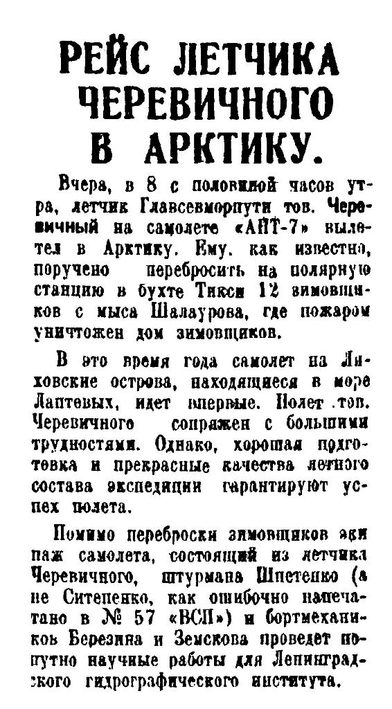 Вчера, в 8 с половиной часов утра, летчик Главсевморпути тов. Черевичный на самолете "АНТ-7» вылетел в Арктику. Ему, как известно, поручено перебросить на полярную станцию в бухте Тикси 12 зимовщиков с мыса Шалаурова, где пожаром уничтожен дом зимовщиков.