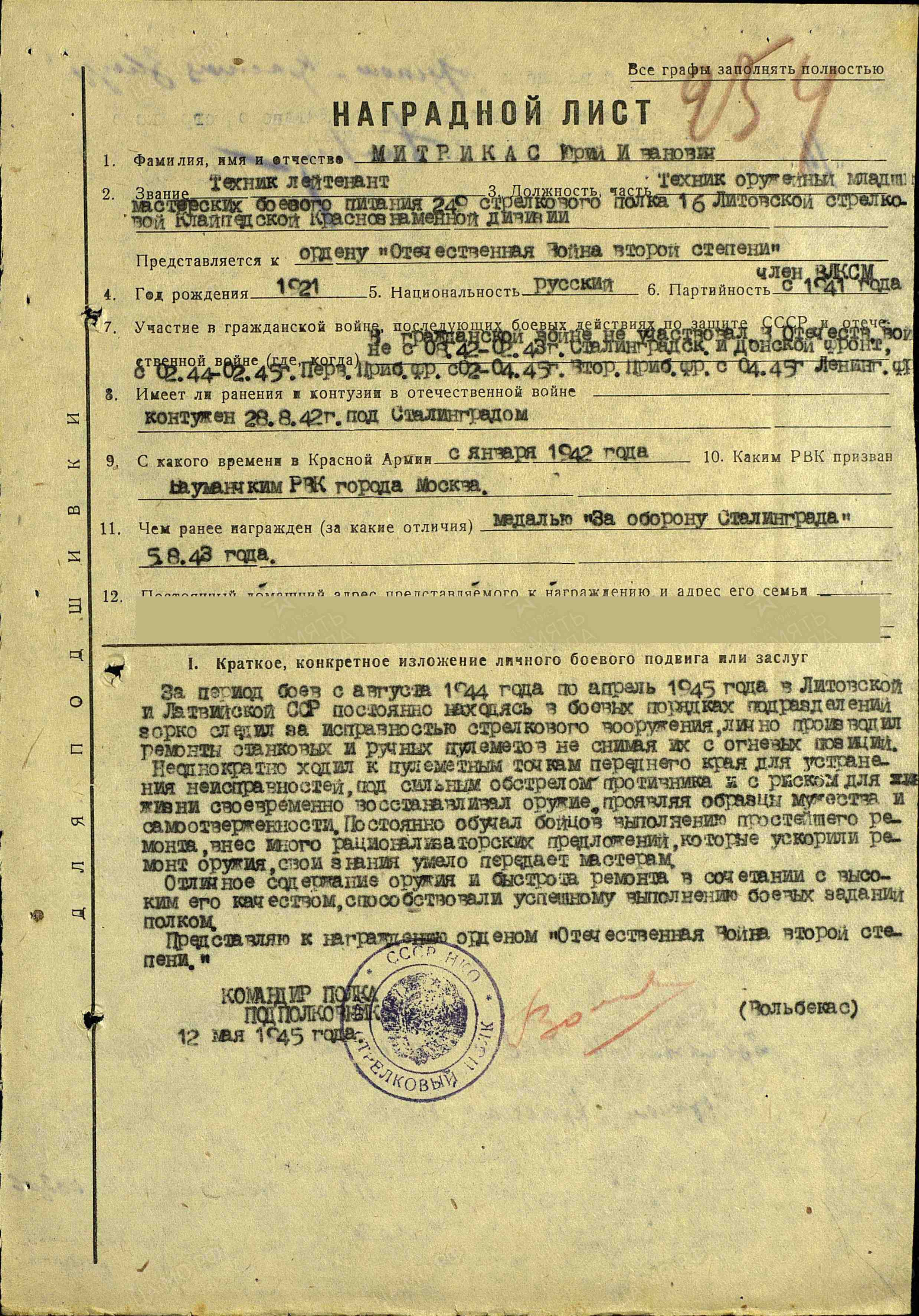 Приказ 240 по ГУСМП Москва 30.10.1943г.
