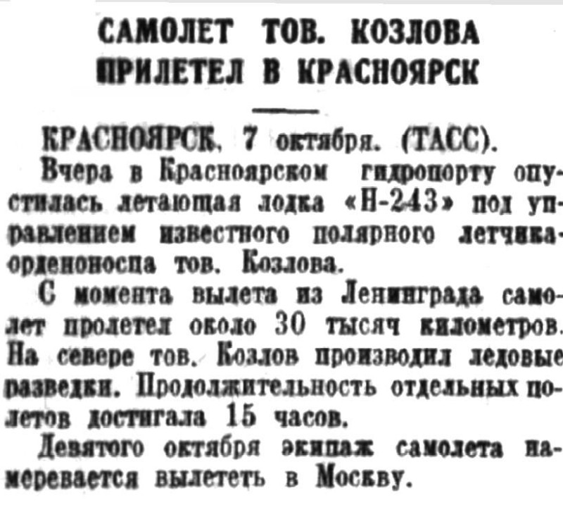 Вчера в Красноярском гидропорту опустилась летающая лодка «Н-243» под управлении известного полярного летчика-орденоносца тов. Козлова.