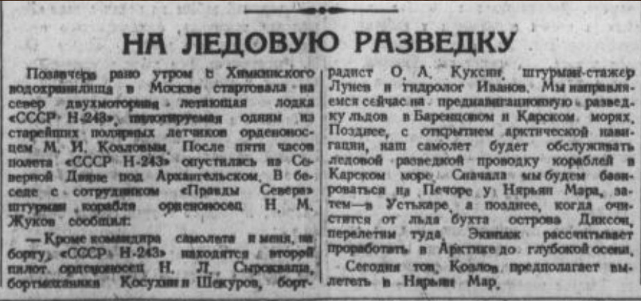 Ледовая разведка в 1939г. … Карское море: … 3. Н-243 – командир пилот Козлов; …