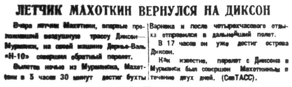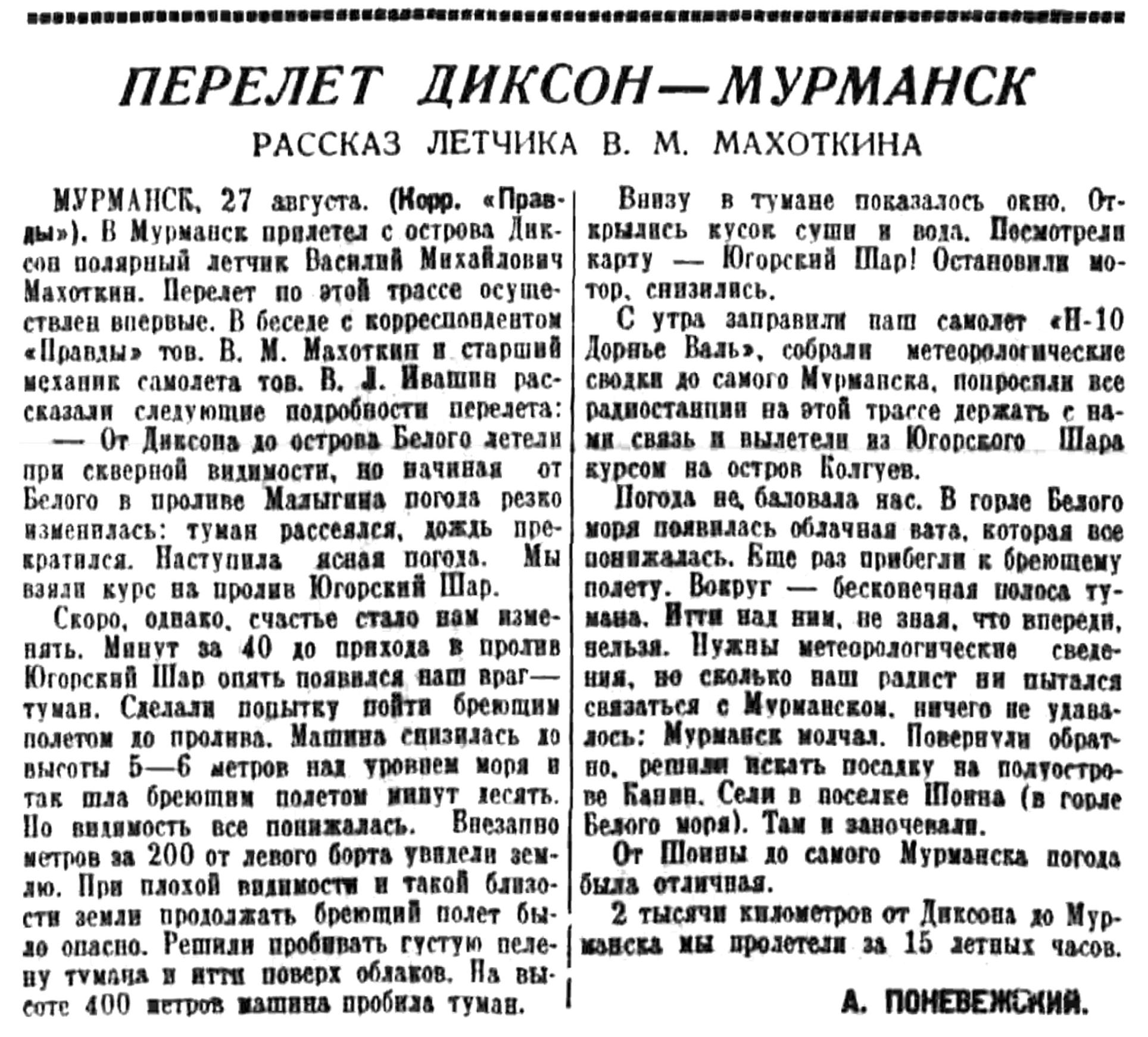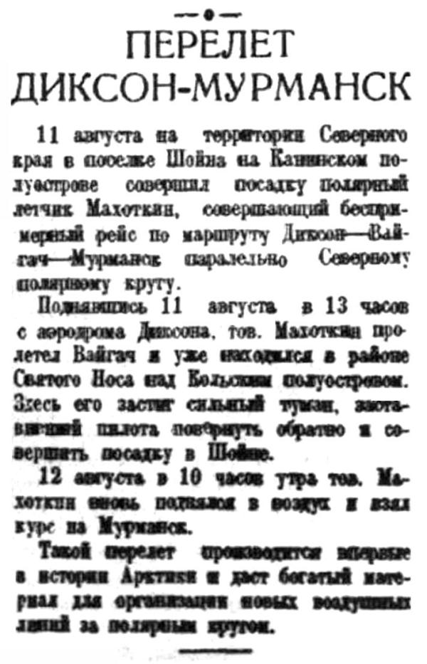 Правда, 1935 , № 237, 28 августаПЕРЕЛЕТ ДИКСОН — МУРМАНСК
