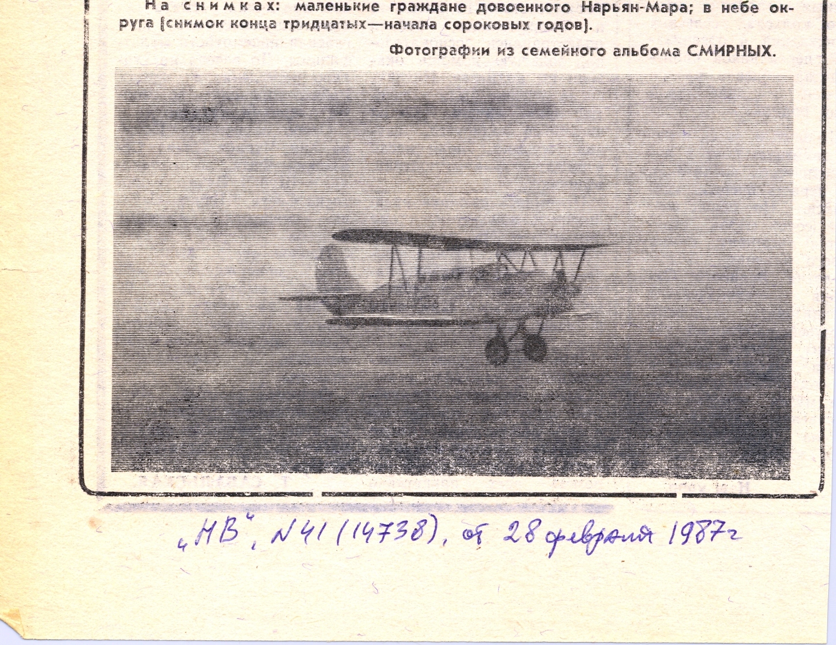 Вот такой самолет обнаружил, в местной газете "Нарьяна-Вындер" № 41 (14738), за 28 февраля 1987 г.