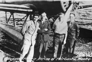 Тепло принял советских авиаторов Фербенкс — крупнейший населенный пункт Аляски. Затем —Ном, с которым их связывали воспоминания о днях, когда они доставляли сюда с Чукотки Джемса Маттерна с остатками его машины. Немало трудностей преодолели, совершая бросок через Берингов пролив, закрытый туманами... Уэлен, затем знакомое чукотское селение Ванкарем. Оно значительно разрослось, благоустроилось после челюскинской эпопеи... До бухты Тикси шли вдоль морского побережья. Приводнялись в Колючи-нской губе. А на следующей остановке, в бухте Амбарчик, их ждал приятный сюрприз: встретились с экипажем гидросамолета «СССР-Н-2» под командованием Молокова, который совершал перелет по всей трассе Северного морского пути — от бухты Провидения до Архангельска!
