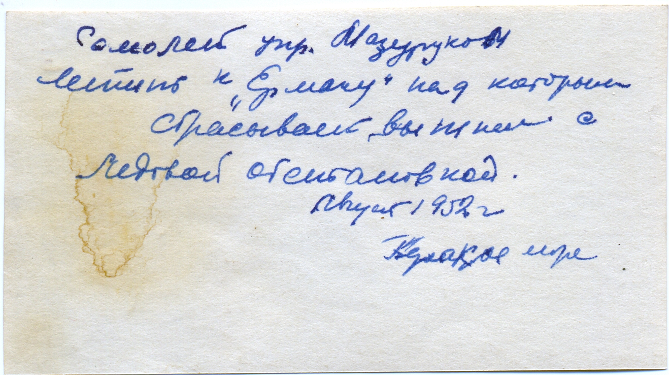 Фото из личного архива. Подписям на оборотках фотографий можно верить очень редко, но в данном случае, подпись очень хорошо соотносится с данными о полётах И.П.Мазурука на этом борту в августе 1952 года, приведёнными уважаемым SVF в этой ветке чуть выше.