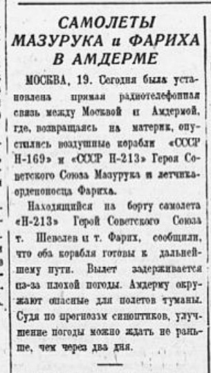 Командир самолета "Н-211" - Герой Советского Союза М. С. Бабушкин. В составе этого экипажа - пилот тов. Цыганов, штурман тов. Глуменко, первый борт-механик тов. Бобченко, вторые борт-механики тт. Нелидов и Проскурин, борт-радист тов. Разумов, радиоинженер тов. Белякович и астроном тов. Шавров. Третьим самолетом - "Н-212" командует тов. Я.Д. Мошковский. В составе экипажа - пилот тов. Глущенко, штурман тов. Саморуппо, первый борт-механик тов. Крылов, вторые борт-механики тт. Коротаев и Бойко, борт-радист т. Хапалайнен, главный инженер экспедиции тов. Е.К. Стоман и инженер тов. Качкачьян.