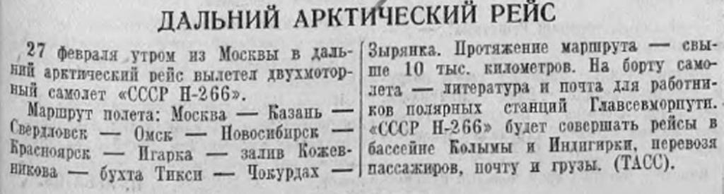 Зырянка. Протяжение маршрута — свыше 10 тыс. километров. На борту самолета — литература и почта для работников полярных станций Главсевморпути. «СССР Н-266» будет совершать рейсы в бассейне Колымы и Индигирки, перевозя пассажиров, почту и грузы. (ТАСС).