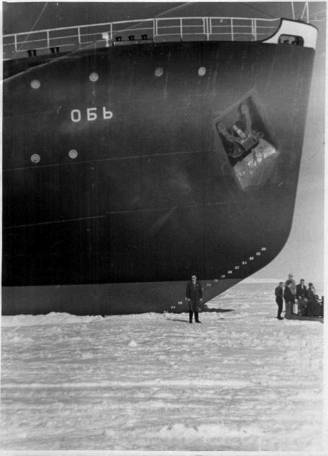 С давних пор я мечтаю полюбоваться «Арктикой». Еще с того времени, как атомоход отправился на штурм полюса, осталось в памяти слышанное: длина — 148 метров, ширина — 30, водоизмещение — 23 460 тонн. 150 кают, бассейн, кинозал, спортзал, финская баня...— одним словом, эдакий плавающий колосс. Не желая что-либо пропустить, я пробираюсь в кабину,