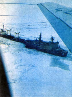 Издали, среди бескрайней белизны льдов, атомоход показался мне не таким уж и большим. Только потом, когда мы раза два пронеслись рядом с ледоколом на бреющем, я смог оценить его размеры. С заснеженной палубой, заледенелым носом «Арктика» казалась гигантским живым существом, приспособленным для жизни среди льдов. Каша ледяных обломков выстилала путь за ней и впереди нее. Чувствовалось, что атомоходу льды не препятствие, встал он лишь, оберегая, как детеныша, ведомое им судно. Так и было на самом деле.