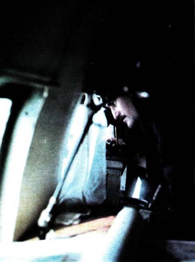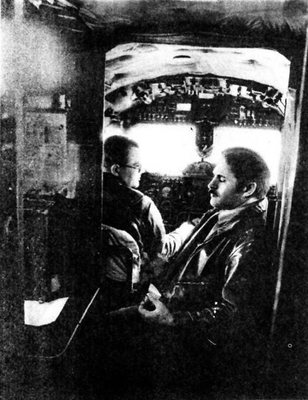 Самолет по-прежнему продолжает нестись в нескольких десятках метров надо льдом, Николай Дмитриев, штурман, прокладывает курс, просчитывая что-то на логарифмической линейке. Из кабины выходит улыбающийся Саша Ишуков. «Медведя не видели? — спрашивает меня.— Только что прошел по правому борту». Где уж теперь при такой скорости его искать! Саша ставит на плиту кастрюлю, достает продукты и начинает готовить обед. Я захожу в кабину.