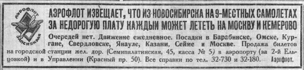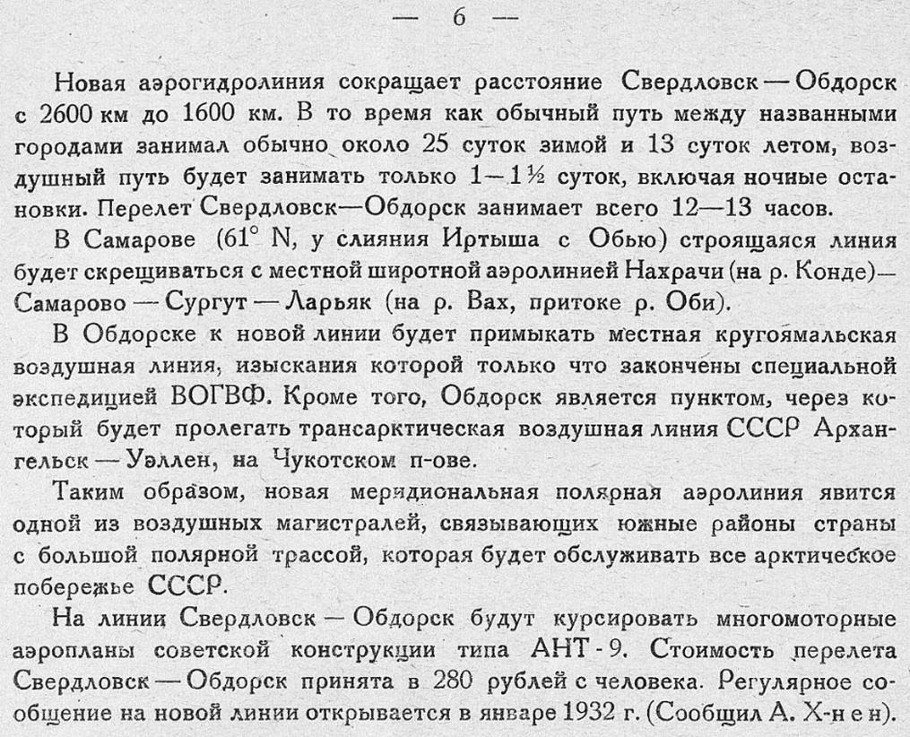 На линии Свердловск — Обдорск будут курсировать многомоторные аэропланы советской конструкции типа АНТ - 9. Стоимость перелета Свердловск — Обдорск принята в 280 рублей с человека. Регулярное сообщение на новой линии открывается в январе 1932 г.