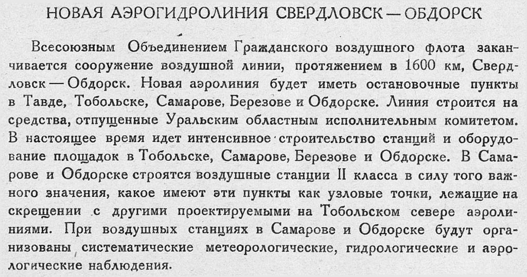 Бюллетень Арктического института СССР. № 1.-Л., 1932, с.5-6.НОВАЯ АЭРОГИДРОЛИНИЯ СВЕРДЛОВСК — ОБДОРСКВсесоюзным Объединением Гражданского воздушного флота заканчивается сооружение воздушной линии, протяжением в 1600 км, Свердловск — Обдорск. Новая аэролиния будет иметь остановочные пункты в Тавде, Тобольске, Самарове, Березове и Обдорске. Линия строится на средства, отпущенные Уральским областным исполнительным комитетом. В настоящее время идет интенсивное строительство станций и оборудование площадок в Тобольске, Самарове, Березове и Обдорске. В Самарове и Обдорске строятся воздушные станции II класса в силу того важного значения, какое имеют эти пункты как узловые точки, лежащие на скрещении с другими проектируемыми на Тобольском севере аэролиниями. При воздушных станциях в Самарове и Обдорске будут организованы систематические метеорологические, гидрологические и аэрологические наблюдения.