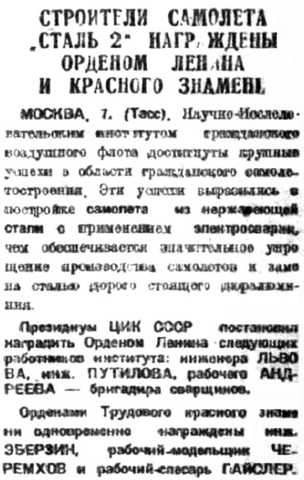 МОСКВА. 7. (Тасс). Научно-Исследовательским институтом гражданского воздушного флота достигнуты крупные успехи в области гражданского самолетостроения. Эти успехи выразились в постройке самолета из нержавеющей стали с применением электросварки, чем обеспечивается значительное упрощение производства самолетов и замена сталью дорого стоящего дюралюминия.