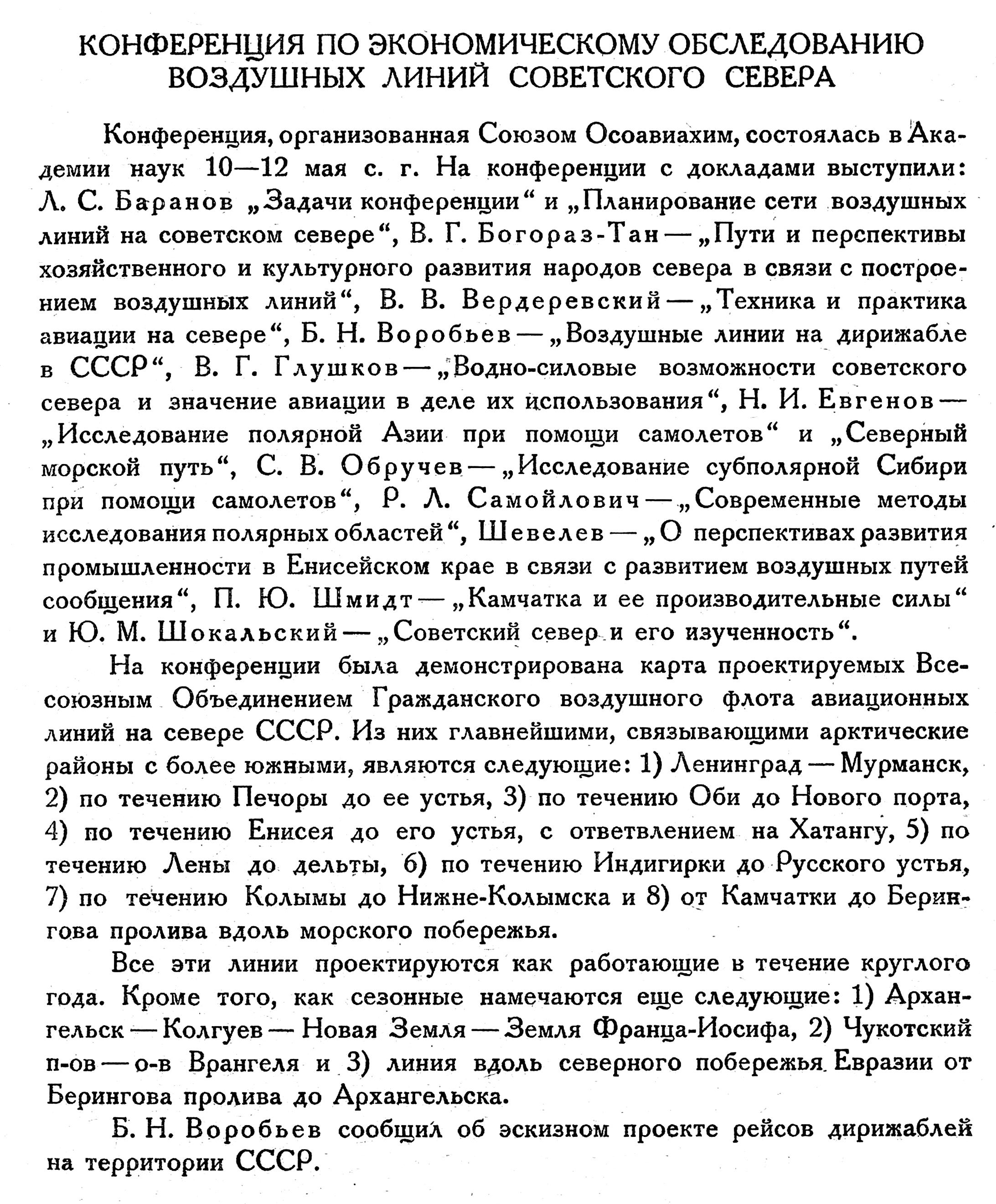 Конференция, организованная Союзом Осоавиахим, состоялась в Академии наук 10—12 мая с. г. На конференции с докладами выступили: Л. С. Баранов „Задачи конференции" и „Планирование сети воздушных линий на советском севере", В. Г. Богораз-Тан — „Пути и перспективы хозяйственного и культурного развития народов севера в связи с построением воздушных линий“, В. В. Вердеревский — „Техника и практика авиации на севере", Б. Н. Воробьев — „Воздушные линии на дирижабле в СССР", В. Г. Глушков — „Водно-силовые возможности советского севера и значение авиации в деле их использования", Н. И. Евгенов — „Исследование полярной Азии при помощи самолетов" и „Северный морской путь“, С. В. Обручев —„Исследование субполярной Сибири при помощи самолетов", Р. Л. Самойлович — „Современные методы исследования полярных областей ", Шевелев — „О перспективах развития промышленности в Енисейском крае в связи с развитием воздушных путей сообщения", П. Ю. Шмидт—„Камчатка и ее производительные силы" и Ю. М. Шокальский — „Советский север и его изученность".