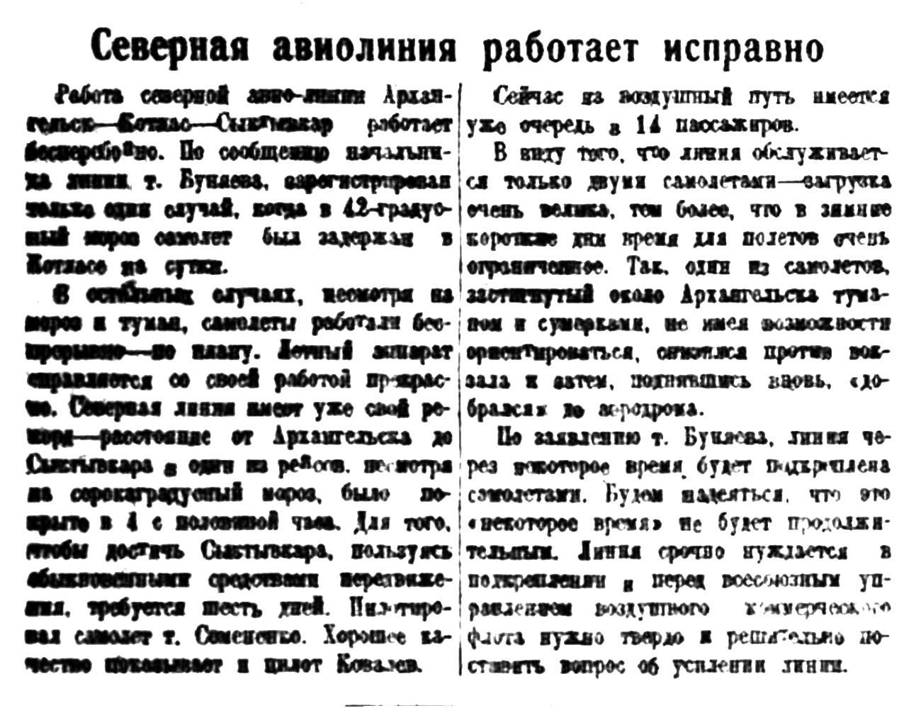 В остальных случаях, несмотря на мороз и туман, самолеты работали беспрерывно - по плану. Летный аппарат справлялся со своей работой прекрасно. Северная линия имеет уже свой рекорд - расстояние от Архангельска до Сыктывкара в один из рейсов, несмотря на сорокаградусный мороз, было покрыто в 4 с половиной часа. Для того, чтобы достичь Сыктывкара, пользуясь обыкновенными средствами передвижения, требуется шесть дней. Пилотировал самолет т. Семененко. Хорошее качество показывает и пилот Ковалев.