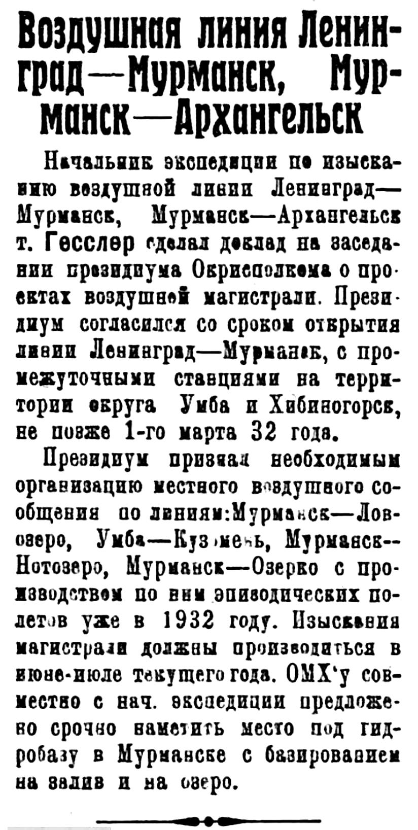 Начальник экспедиции по изысканию воздушной линии Ленинград — Мурманск, Мурманск — Архангельск т. Гесслер сделал доклад на заседании президиума Окрисполкома о проектах воздушной магистрали. Президиум согласился со сроком открытия линии Ленинград — Мурманск, с промежуточными станциями на территории округа Умба и Хибиногорск, не позже 1-го марта 32 года.