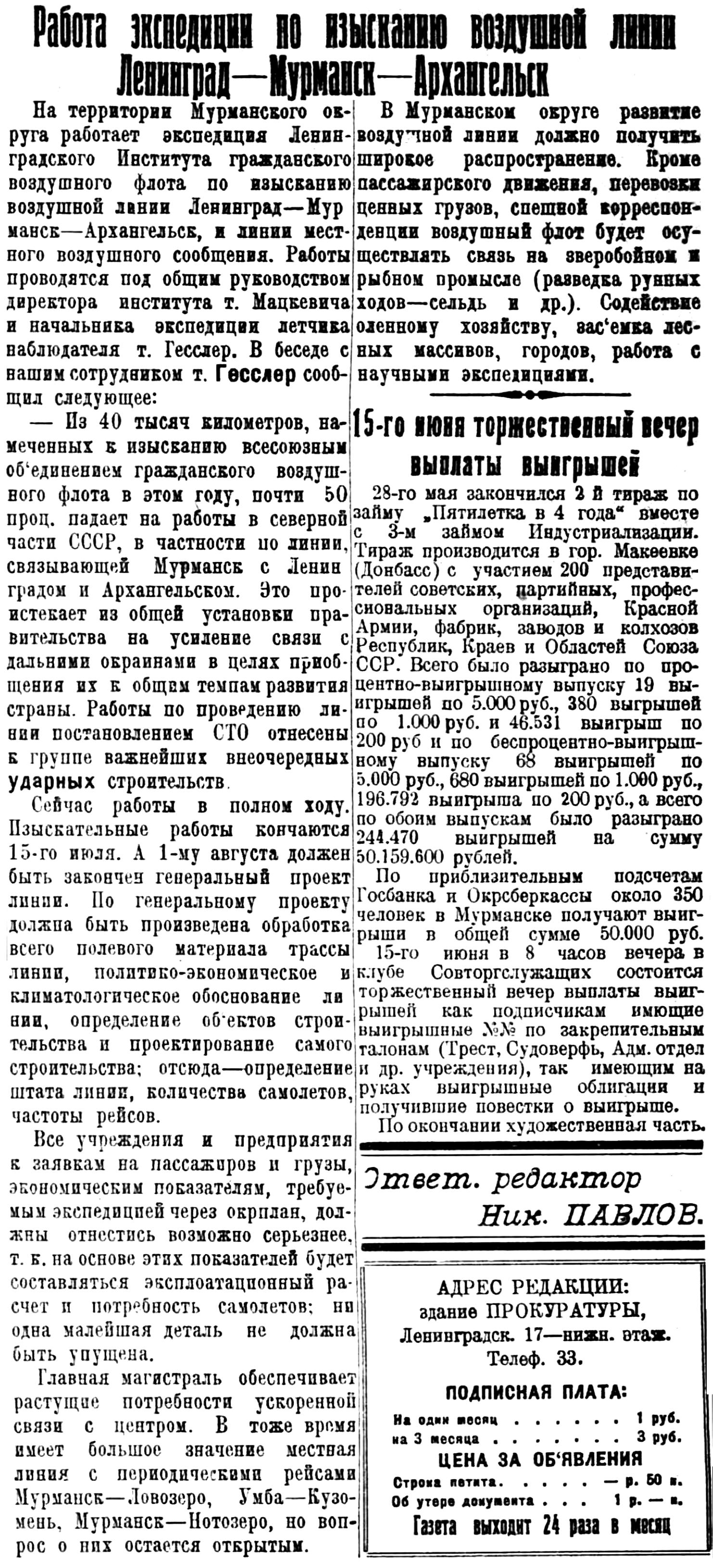 — Из 40 тысяч километров, намеченных к изысканию всесоюзным объединением гражданского воздушного флота в этом году, почти 50 проц. падает на работы в северной части СССР, в частности по линии, связывающей Мурманск с Ленинградом и Архангельском. Это проистекает из общей установки правительства на усиление связи с дальними окраинами в целях приобщения их к общим темпам развития страны. Работы по проведению линии постановлением СТО отнесены к группе важнейших внеочередных ударных строительств.