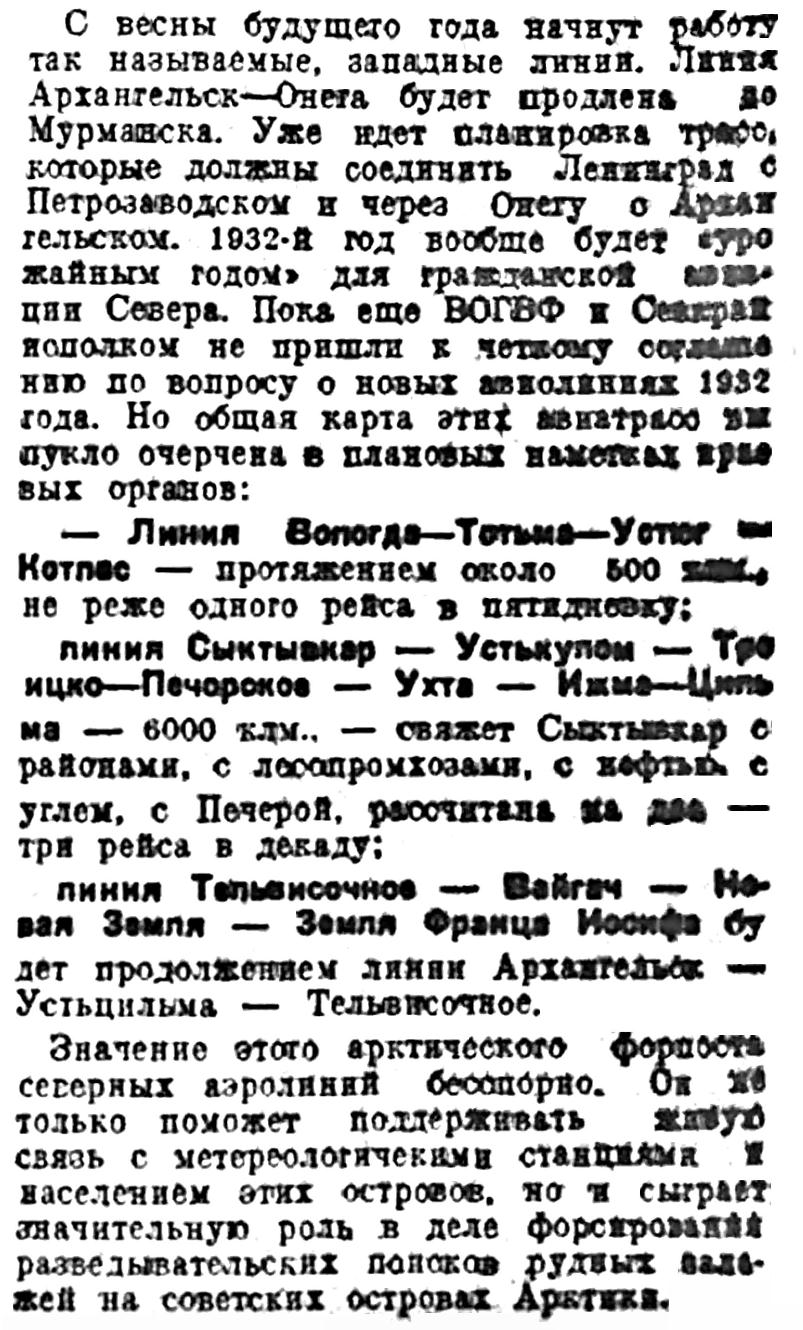 С весны будущего года начнут работу так называемые, западные линии. Линия Архангельск — Онега будет продлена до Мурманска. Уже идет планировка трасс, которые должны соединить Ленинград с Петрозаводском и через Онегу с Архангельском. 1932-й год вообще будет "урожайным годом" для гражданской авиации Севера. Пока еще ВОГВФ и Севкрайисполком не пришли к четкому соглашению по вопросу о новых авиолиниях 1932 года. Но общая карта этих авиатрасс выпукло очерчена в плановых наметках краевых органов: