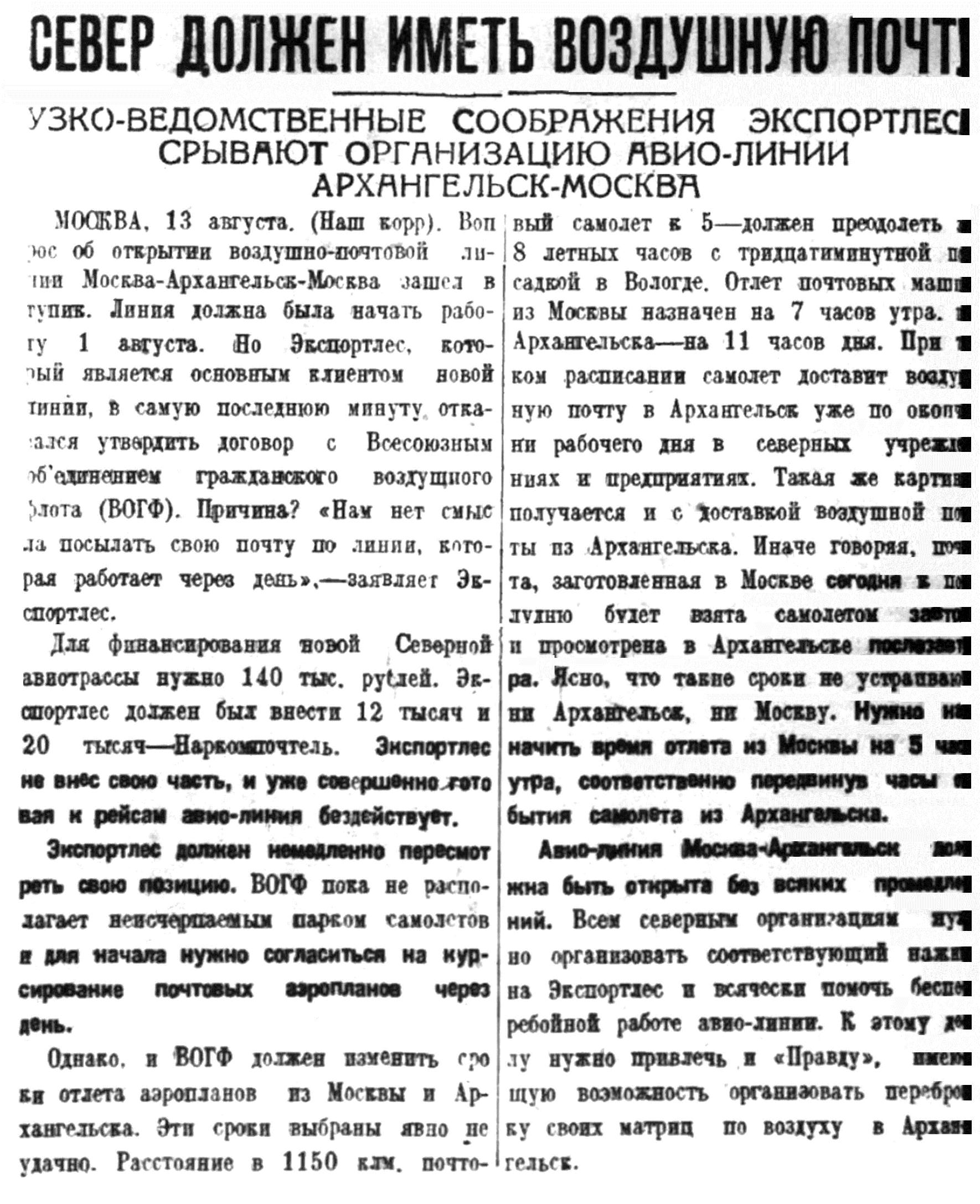 Для финансирования новой Северной авиатрассы нужно 140 тыс. рублей. Экспортлес должен был внести 12 тысяч и 20 тысяч — Наркомпочтель. Экспортлес не внес свою часть, и уже совершенно готовая к рейсам авио-линия бездействует.