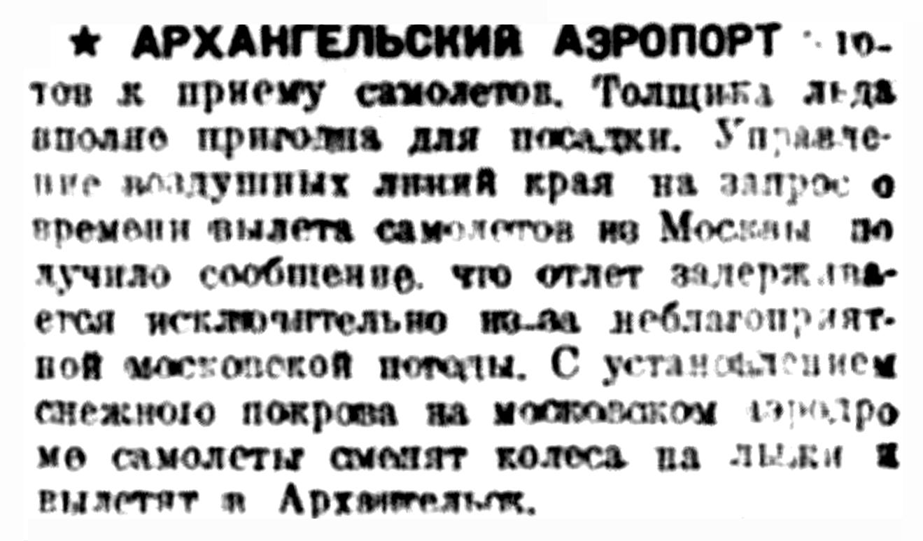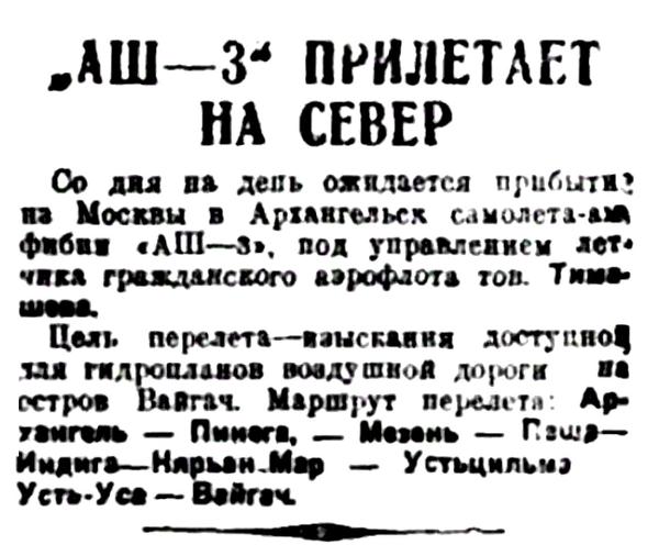 Этим летом создается регулярная почтово-пассажирская связь с заводами, факториями, зимовками, разбросанными по крайнему Северу. Обеспечена регулярная связь с Игарским районом. Помимо ледовой разведки самолеты будут обслуживать также экономические, геологические, геодезические, гидрографические и другие изыскания в Нордвике, на Северной