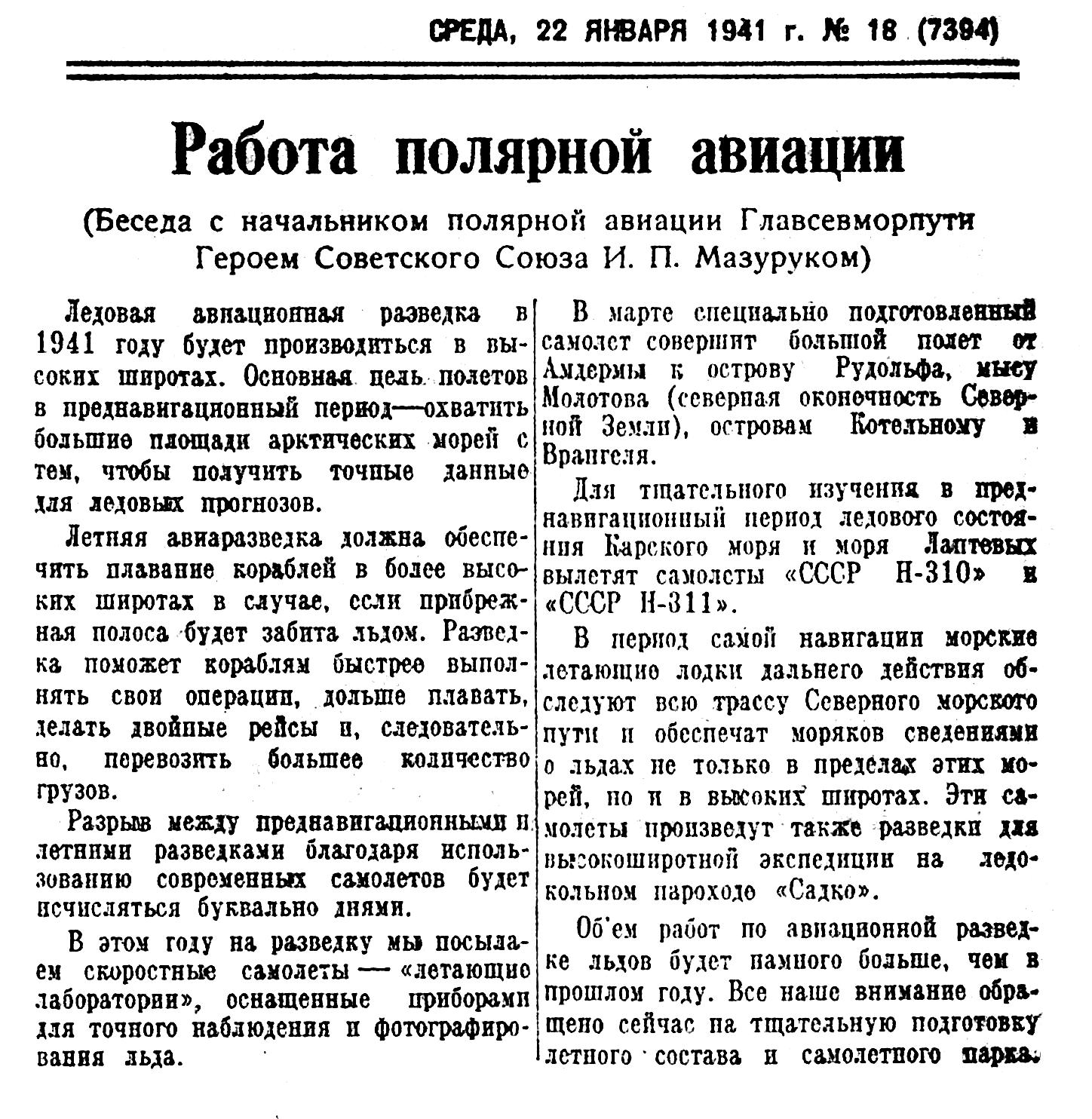 (Беседа с начальником полярной авиации Главсевморпути Героем Советского Союза И. П. Мазуруком)