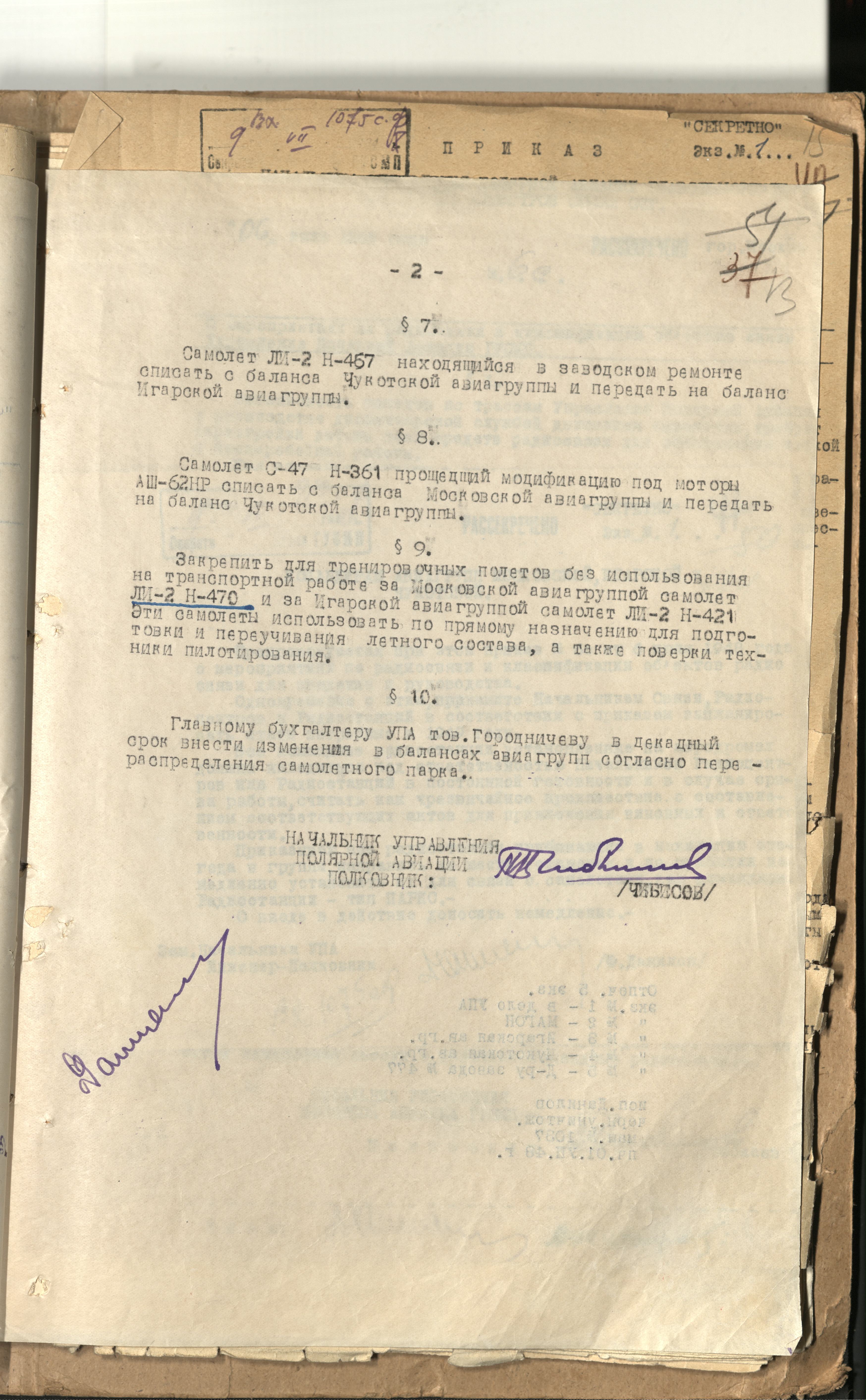 1. К-ру Моск. АГ тов. Юкалову А.А. выделить и закрепить для этой цели три самолёта Ли-2 (1 с-т резервный) и укомплектовать последние опытными экипажами способными обеспечить выполнение полётов в условиях полярной ночи. …