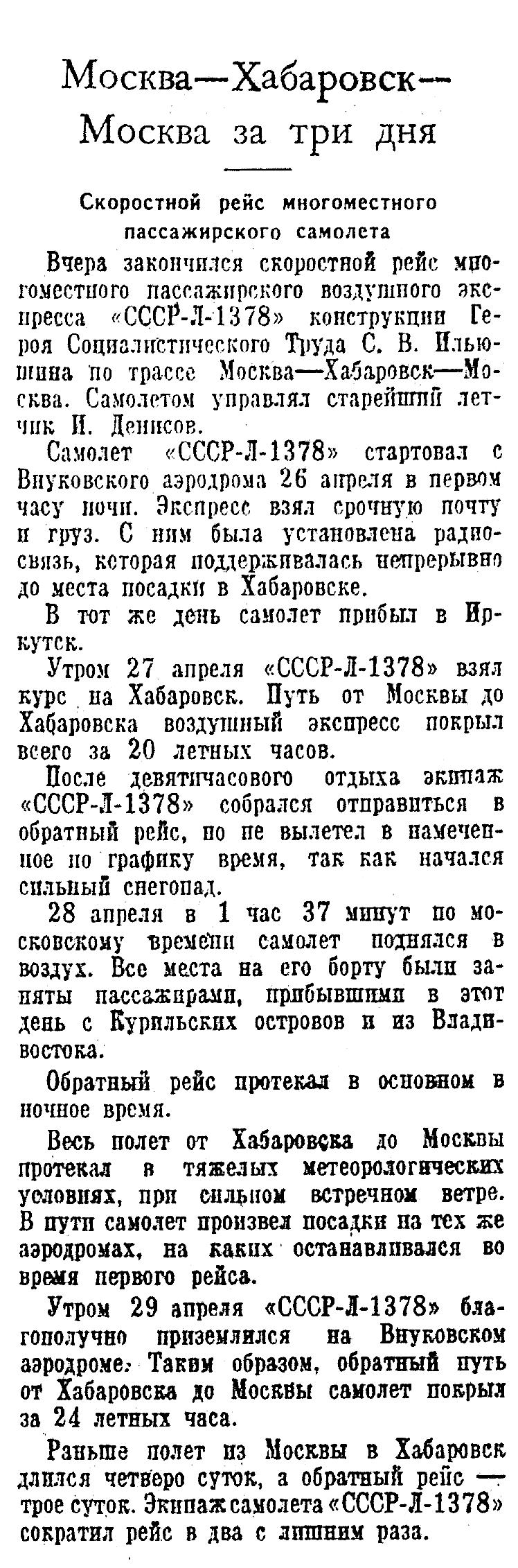 Вчера закончился скоростной рейс многоместного пассажирского воздушного экспресса "СССР-Л-1378» конструкции Героя Социалистического Труда С. В. Ильюшина по трассе Москва — Хабаровск — Москва. Самолетом управлял старейший летчик И. Денисов.