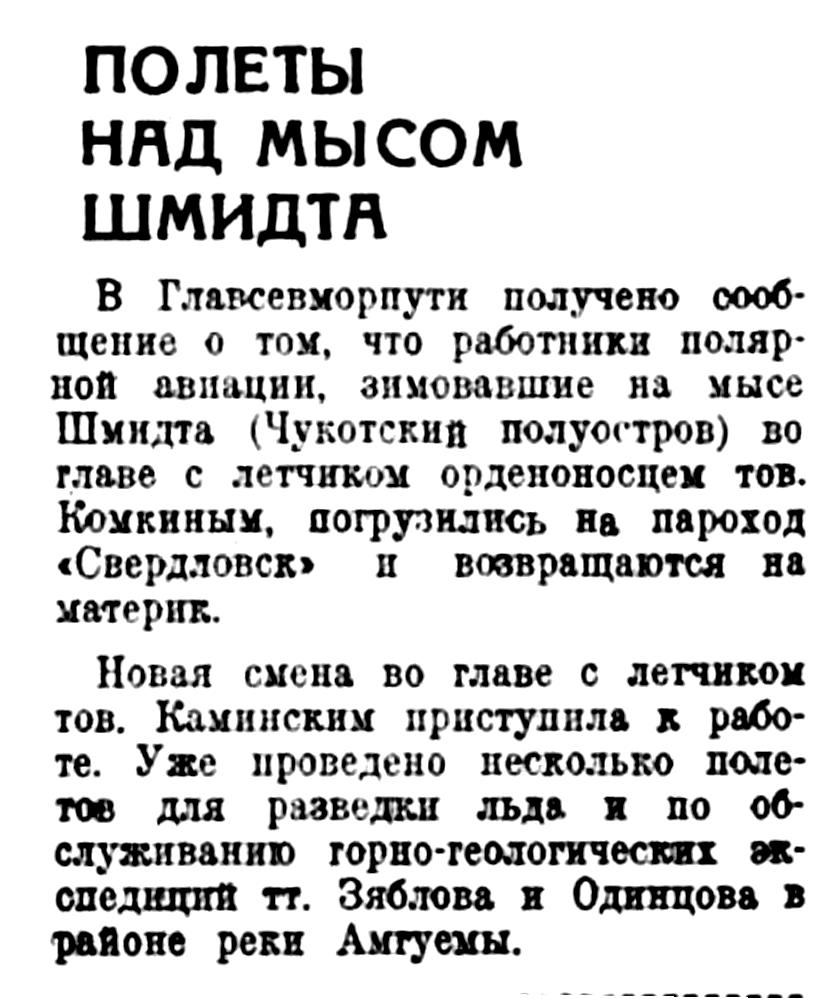 В Главсевморпути получено сообщение о том, что работники полярной авиации, зимовавшие на мысе Шмидта (Чукотский полуостров) во главе с летчиком орденоносцем тов. Конкиным, погрузились на пароход «Свердловск» и возвращаются на материк.