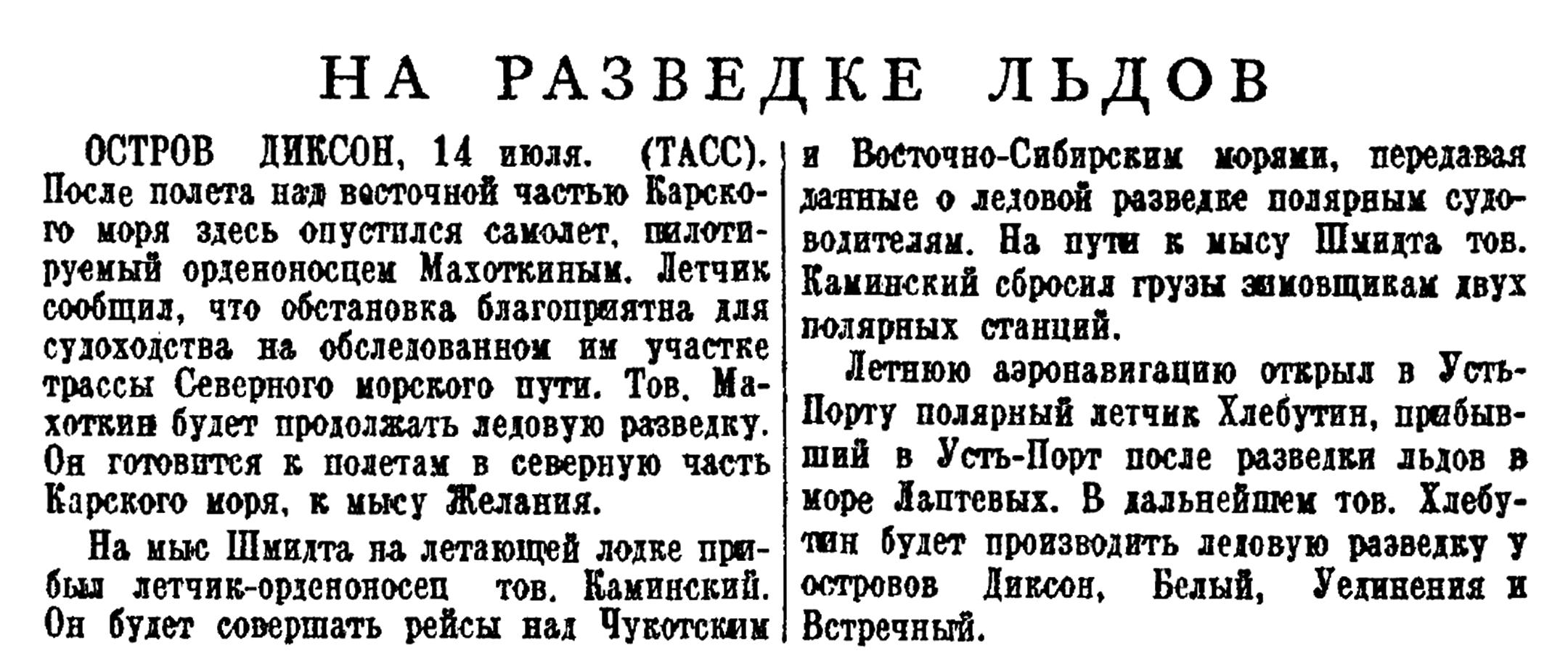 ОСТРОВ ДИКС0Н, 14 июля. (ТАСС). После полета над восточной частью Карского моря здесь опустился самолет, пилотируемый орденоносцем Махоткиным. Летчик сообщил, что обстановка благоприятна для судоходства на обследованном им участке трассы Северного морского пути. Тов. Махоткин будет продолжать ледовую разведку. Он готовится к полетам в северную часть Карского моря, к мысу Желания.