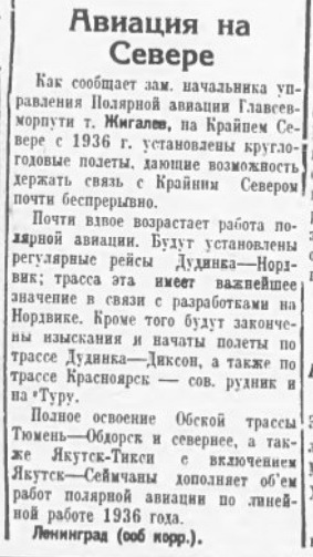На 1936 год, как известно, перенесен и перелет героя Советского Союза т. С. Леваневского через северный полюс по маршруту Москва — Сан-Франциско.