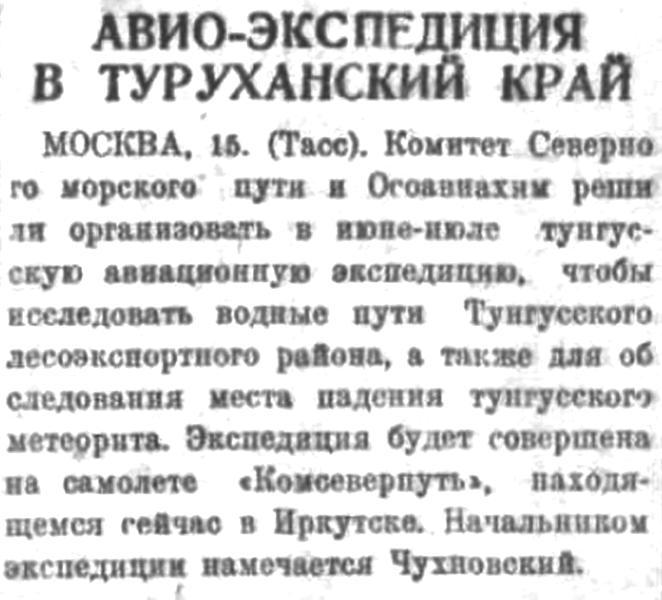 МОСКВА, 15. (Тасс). Комитет Северного морского пути и Осоавиахим решили организовать в июне-июле тунгусскую авиационную экспедицию, чтобы исследовать водные пути Тунгусского лесоэкспортного района, а также для обследования места падения тунгусского метеорита. Экспедиция будет совершена на самолете «Комсеверпуть», находящемся сейчас в Иркутске. Начальником экспедиция намечается Чухновский.