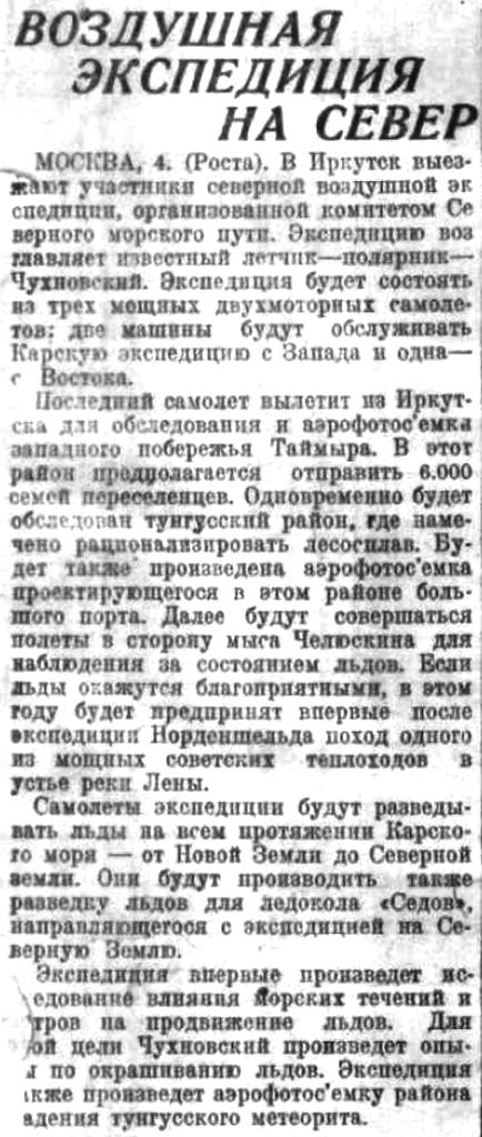 Последний самолет вылетит из Иркутска для обследования и аэрофотосъёмки западного побережья Таймыра. В этот район предполагается отправить 6.000 семей переселенцев. Одновременно будет обследован тунгусский район, где намечено рационализировать лесосплав. Будет также произведена аэрофотосъемка проектирующегося в этом районе большого порта. Далее будут совершаться полеты в сторону мыса Челюскина для наблюдения за состоянием льдов. Если льды окажутся благоприятными, в этом году будет предпринят впервые после экспедиции Норденшельда поход одного из мощных советских теплоходов в устье реки Лены.