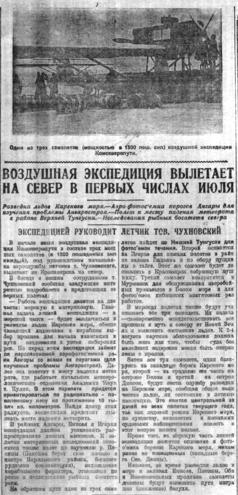 В начале июля воздушная экспедиция Комсеверопути в составе трех мощных самолетов (в 1500 лошадиных сил каждый), под руководством начальника аэрослужбы летчика т. Чухновского, вылетает из Красноярска на север.