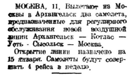 АРХАНГЕЛЬСК, 23 января. Сегодня прибыл первый самолет северной аэролинии Архангельск—Сыктывкар (бывш. Устьсысольск). Второй самолет прибывает завтра. Первый перелет в Сыктывкар назначен в ближайшие дни. «Правда Севера» вносит предложение включить в маршрут аэролинии Великий Устюг.