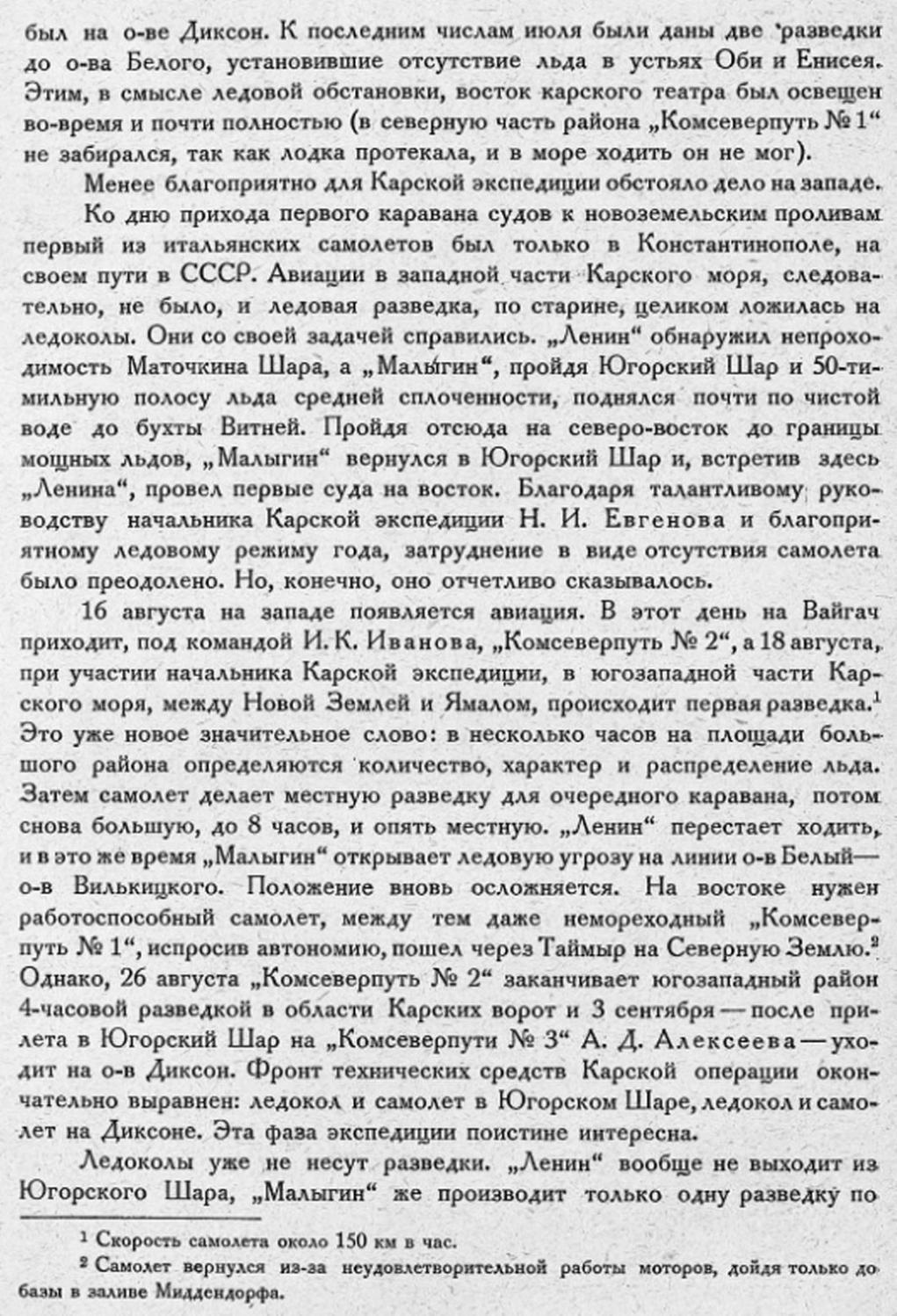 16 августа на западе появляется авиация. В этот день на Вайгач приходит, под командой И. К. Иванова, „Комсеверпуть № 2“, а 18 августа, при участии начальника Карской экспедиции, в югозападной части Карского моря, между Новой Землей и Ямалом, происходит первая разведка. {1} Это уже новое значительное слово: в несколько часов на площади большого района определяются количество, характер и распределение льда. Затем самолет делает местную разведку для очередного каравана, потом снова большую, до 8 часов, и опять местную. „Ленин" перестает ходить, и в это же время „Малыгин" открывает ледовую угрозу на линии о-в Белый — о-в Вилькицкого. Положение вновь осложняется. На востоке нужен работоспособный самолет, между тем даже немореходный „Комсеверпуть № 1", испросив автономию, пошел через Таймыр на Северную Землю. {2} Однако, 26 августа „Комсеверпуть № 2“ заканчивает югозападный район 4-часовой разведкой в области Карских ворот и 3 сентября — после прилета в Югорский Шар на „Комсеверпути № 3“ А. Д. Алексеева — уходит на о-в Диксон. Фронт технических средств Карской операции окончательно выравнен: ледокол и самолет в Югорском Шаре, ледокол и самолет на Диксоне. Эта фаза экспедиции поистине интересна.