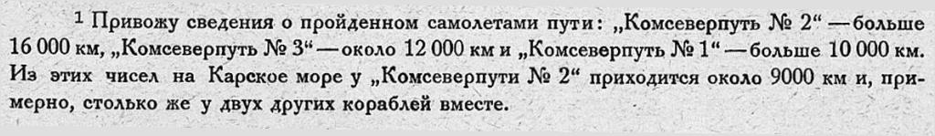 {1} Привожу сведения о пройденном самолетами пути: „Комсеверпуть № 2“ —больше 16 000 км, „Комсеверпуть № 3" — около 12 000 км и „Комсеверпуть № 1“ —больше 10 000 км. Из этих чисел на Карское море у „Комсеверпути № 2“ приходится около 9000 км и, при­мерно, столько же у двух других кораблей вместе.