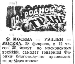 МОСКВА — УЭЛЛЕН —МОСКВА. 28 февраля, в 12 часов З0 минут по московскому времени, самолет товарища Фариха благополучно приземлился в Олекминске.