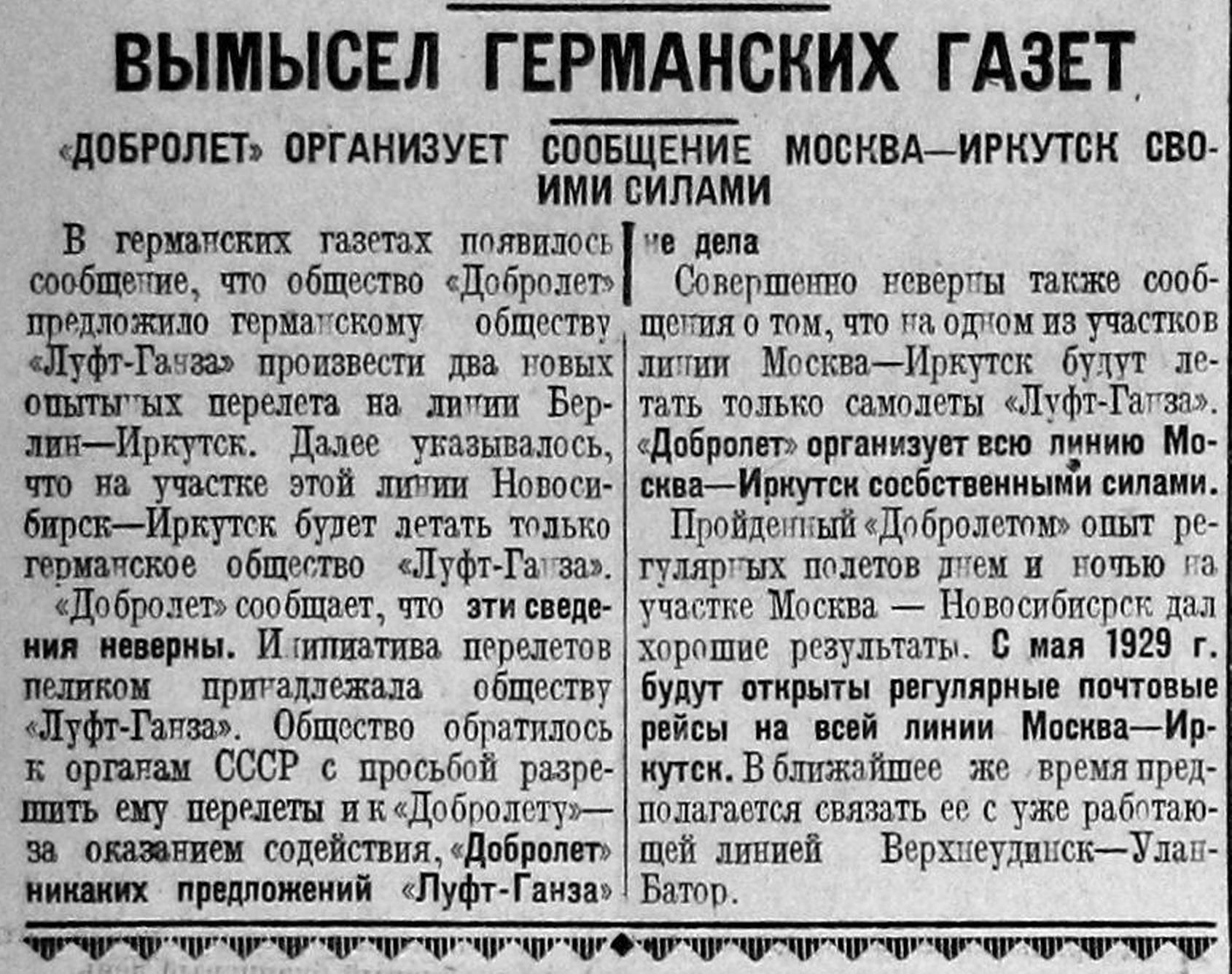 В германских газетах появилось сообщение, что общество «Добролет» предложило германскому обществу «Луфт-Ганза» произвести два новых опытных перелета на линии Берлин — Иркутск. Далее указывалось, что на участке этой линии Новосибирск — Иркутск будет летать только германское общество «Луфт-Газа».