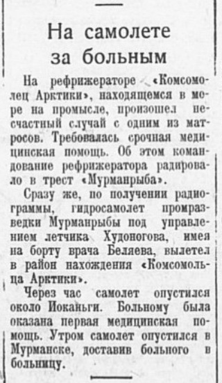 П.6. 15.2.38г. самолёт Ш-2 М-32, пилотом т. Карабановым и командиром лётной группы на «Мурман» тов. Черевичным во время производства полёта ледовой разведки из-за неблагоприятных метеоусловий произвёл вынужденную посадку в Гренландском море неподалёку от л/к «Мурман» (ш 71,12, д 19,25 западная). Самолёт после вынужденной посадки был совершенно исправен. Экипаж самолёта пилот Карабанов и п. Черевичный не смогли произвести запуск мотора т.к. во время подогрева мотора лопнул клапан насоса, который экипаж отремонтировать не мог.