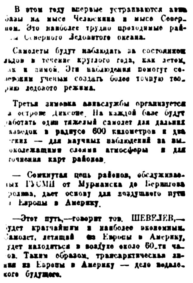 Правительство поставило перед ГУСМП боевою задачу: осуществить северный путь от Мурманска до Берингова пролива. Советская авиация разрешит эту задачу уже в текущем году.