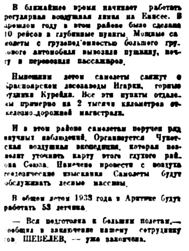 И в этом районе самолетам поручен ряд научных наблюдений. Организуется Чукотская воздушная экспедиция, которая позволит уточнить карту этого глухого района Союза. Намечено провести с воздуха геодезические изыскания. Самолеты будут обслуживать лесные массивы.