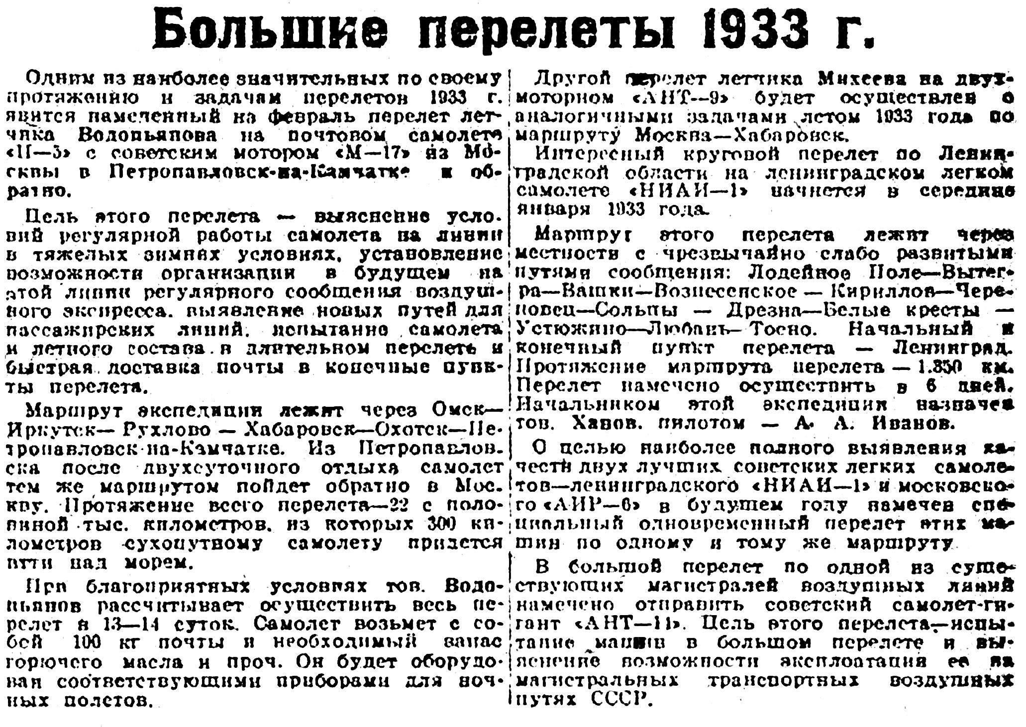 Одним из наиболее значительных по своему протяжению и задачам перелетов 1933 г. явится намеченный на февраль перелет летчика Водопьянова на почтовом самолете "П—5" с советским мотором "М—17" из Москвы в Петропавловск-на-Камчатке и обратно.