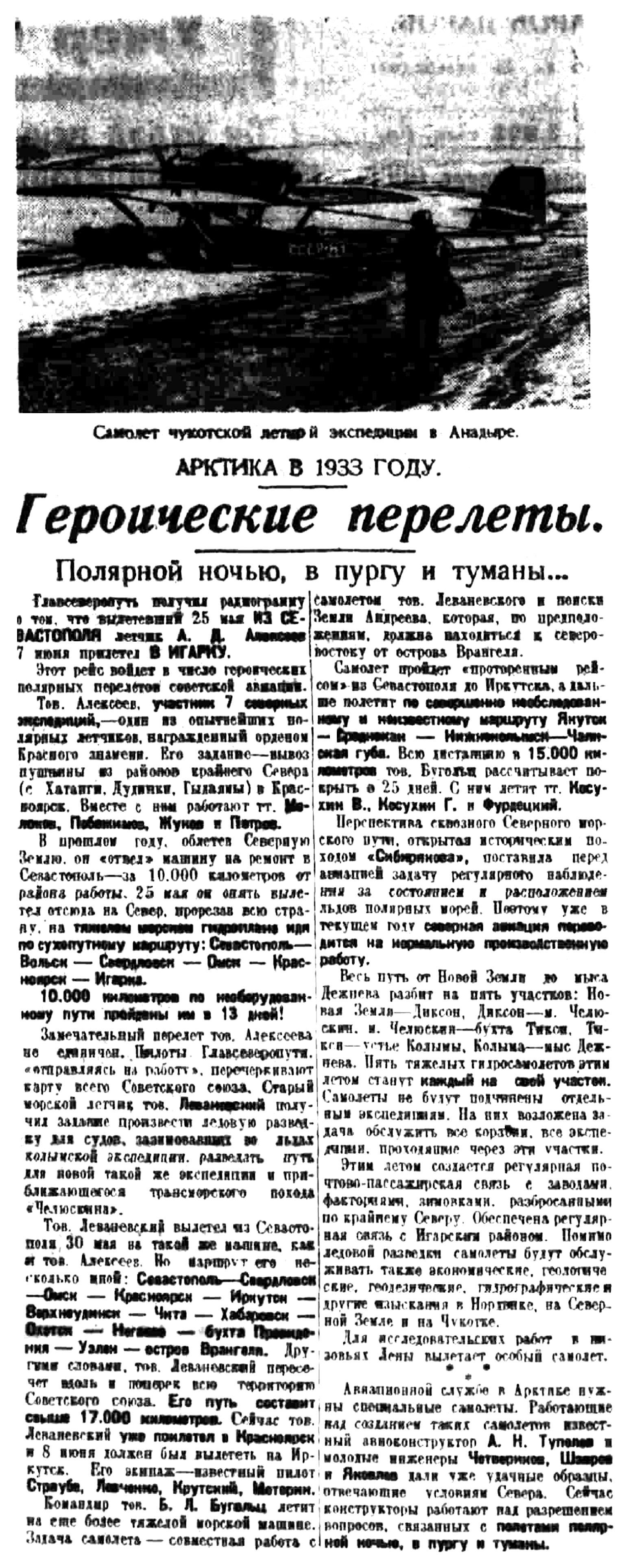 Авиационной службе в Арктике нужны специальные самолеты. Работающие над созданием таких самолетов известный авиаконструктор А. Н. Туполев и молодые инженеры Четвериков, Шавров и Яковлев дали уже удачные образцы, отвечающие условиям Севера. Сейчас конструкторы работают над разрешением вопросов, связанных с полетами полярной ночью, в пургу и туманы.