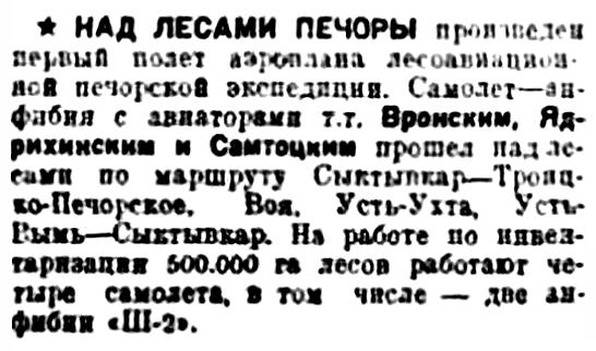 * НАД ЛЕСАМИ ПЕЧОРЫ произведен первый полет аэроплана лесоавиационной печорской экспедиции. Самолет-амфибия с авиаторами т. т. Вронским, Ядрихинским и Самтоцким прошел над лесами по маршруту Сыктывкар — Троицко-Печорское, Воя, Усть-Ухта, Усть-Вымь — Сыктывкар. На работе по инвентаризации 500.000 га лесов работают четыре самолета, в том числе — две амфибии «Ш-2».