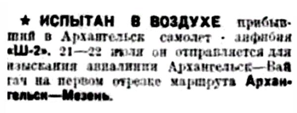 ♦ ИСПЫТАН В ВОЗДУХЕ прибывший в Архангельск самолет-амфибия «Ш-2», 21—22 июля отправляется для