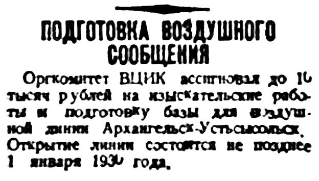 Оргкомитет ВЦИК ассигновал до 10 тысяч рублей на изыскательские работы и подготовку базы для воздушной линии Архангельск - Устьсысольск. Открытие линии состоится не позднее 1 января 1930 года.