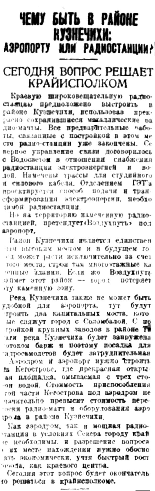 Как аэродром, так и мощная радио-станция в условиях Севера городу крайне необходимы, и разрешение вопроса о их месте нахождения нужно обосновать экономически, учтя быстрый рост города, как краевого центра.