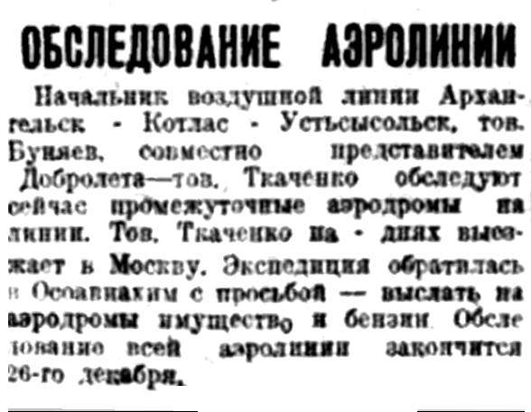 Начальник воздушной линии Архангельск - Котлас - Устьсысольск, тов. Буняев, совместно с представителем Добролета - тов. Ткаченко обследуют сейчас промежуточные аэродромы на линии. Тов. Ткаченко на - днях выезжает в Москву. Экспедиция обратилась в Осоавиахим с просьбой — выслать на аэродромы имущество и бензин. Обследование всей аэролинии закончится 26-го декабря.